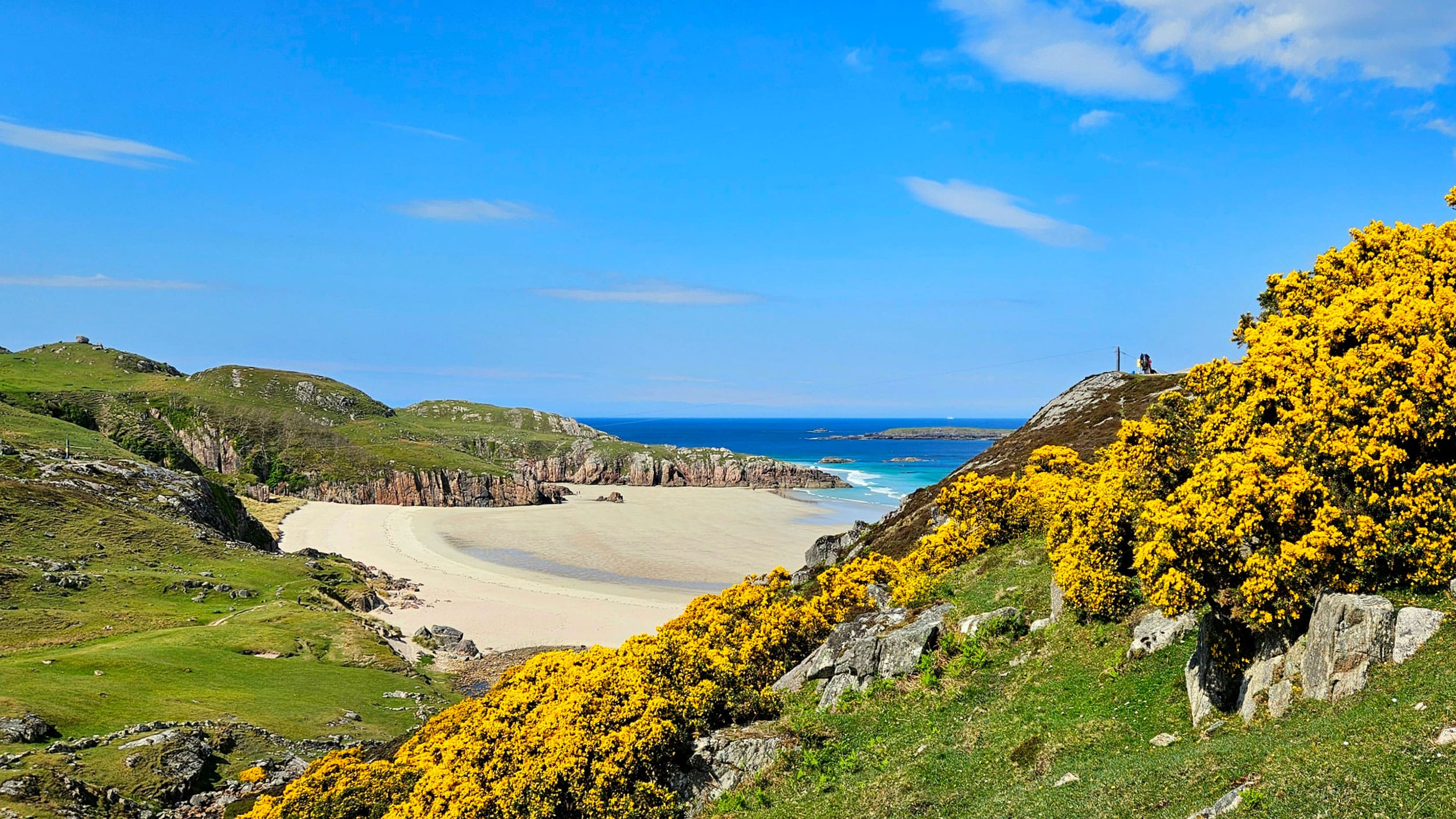 Ceannabeinne Beach is a breathtaking stretch of white sand nestled along the dramatic north coast of Scotland near Durness. With pink-hued rocky cliffs, crystal-clear turquoise waters, and panoramic Atlantic views, it’s a must-visit destination for nature lovers, photographers, and anyone seeking tranquillity and adventure.