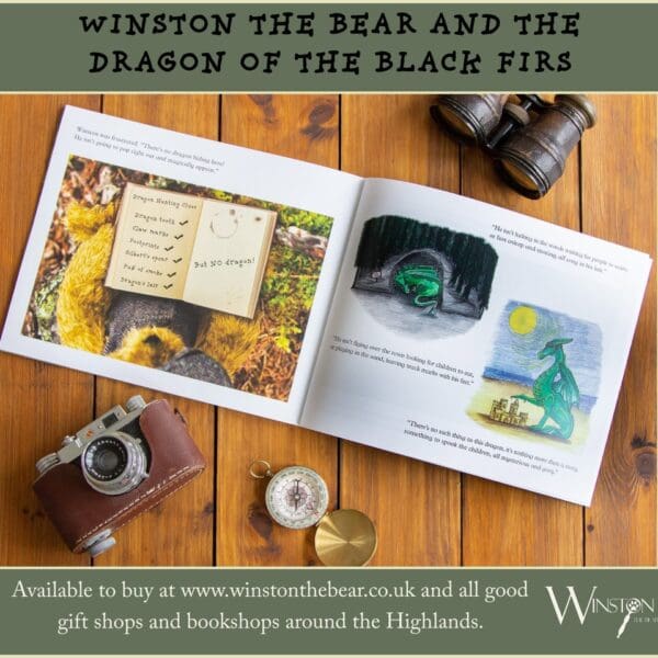 Winston the Bear and the Dragon of the Black Firs is available to buy for £8.99 on Winston’s website (with free shipping) and in all good gift and bookshops around the Highlands.